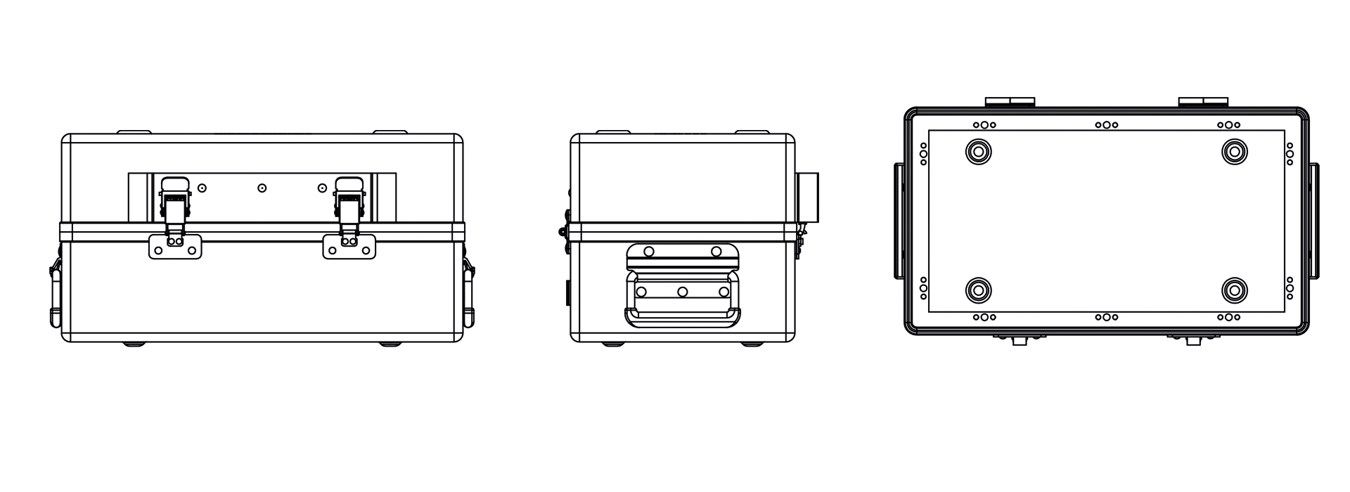 - Protection of latches and hardware is achieved through the use of guarded latches and handles or by incorporating “V“ rails along the perimeter of the case.